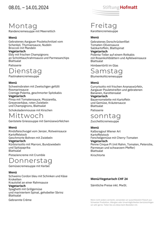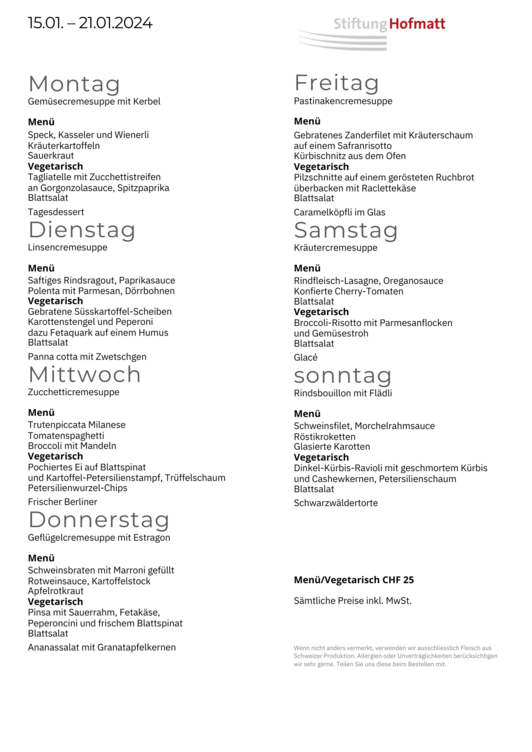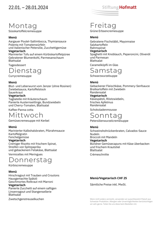 Tagesmenü vegetarisch, Suppe, Salat und Dessert | CHF 25